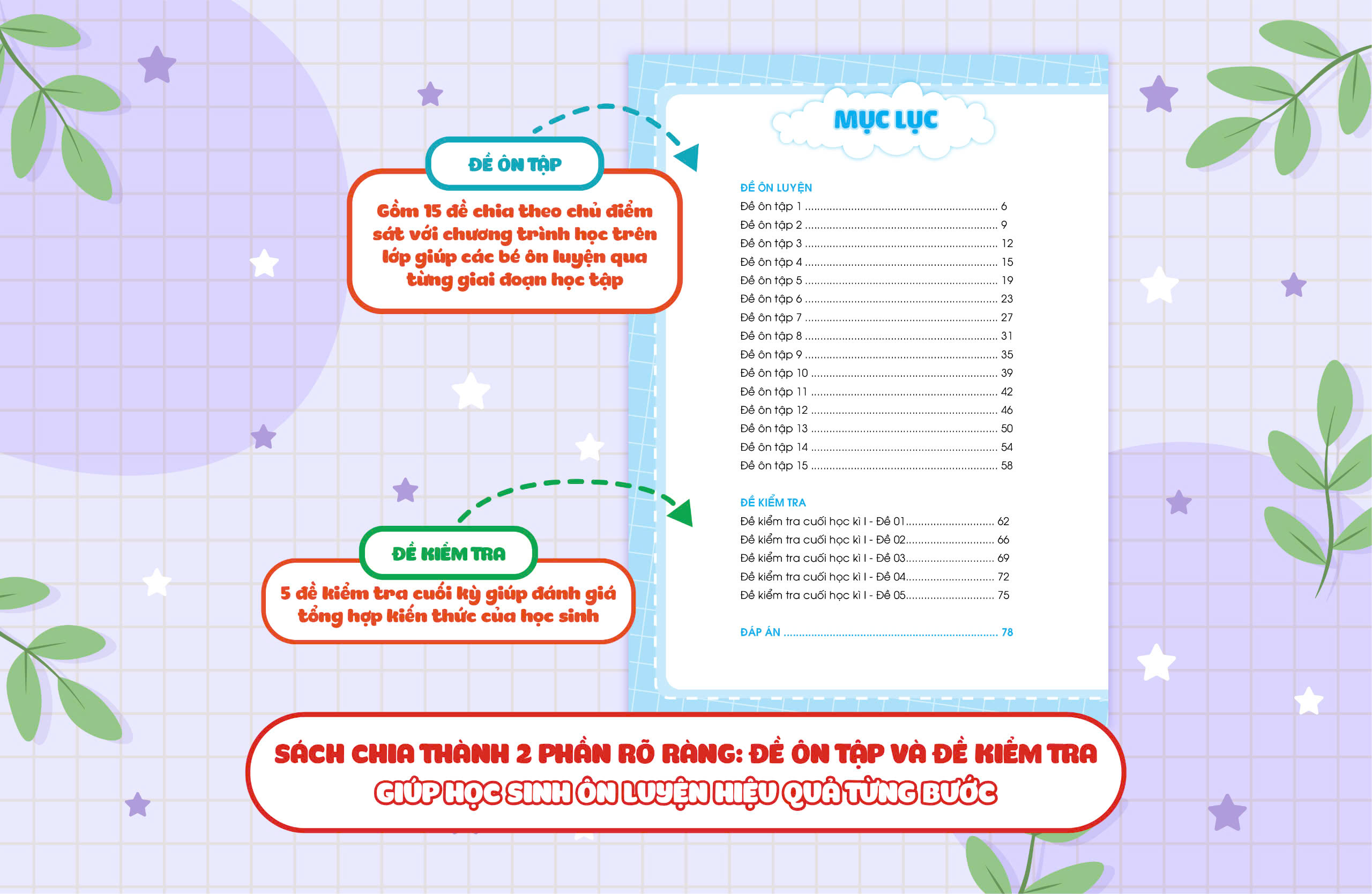 Phần đề ôn tập: gồm 15 đề được chia theo các chủ điểm, ôn tập theo sát chương trình học trên lớp theo giai đoạn.
